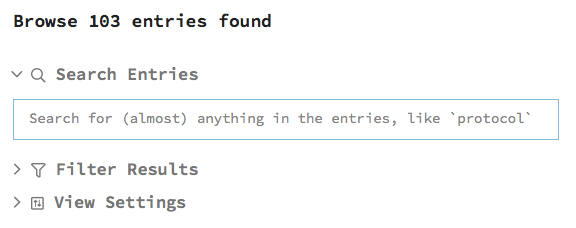 Text search unfolds automatically. The query will search for text inside the entries, as well as data such as